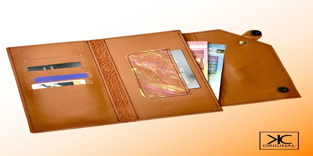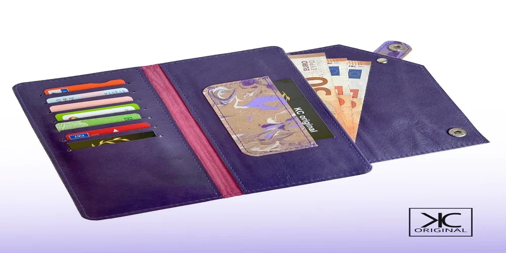 Binnenin vind je diverse vakjes voor pasjes, briefgeld en muntgeld, plus twee extra insteekvakken voor bonnetjes of andere kleine spullen.