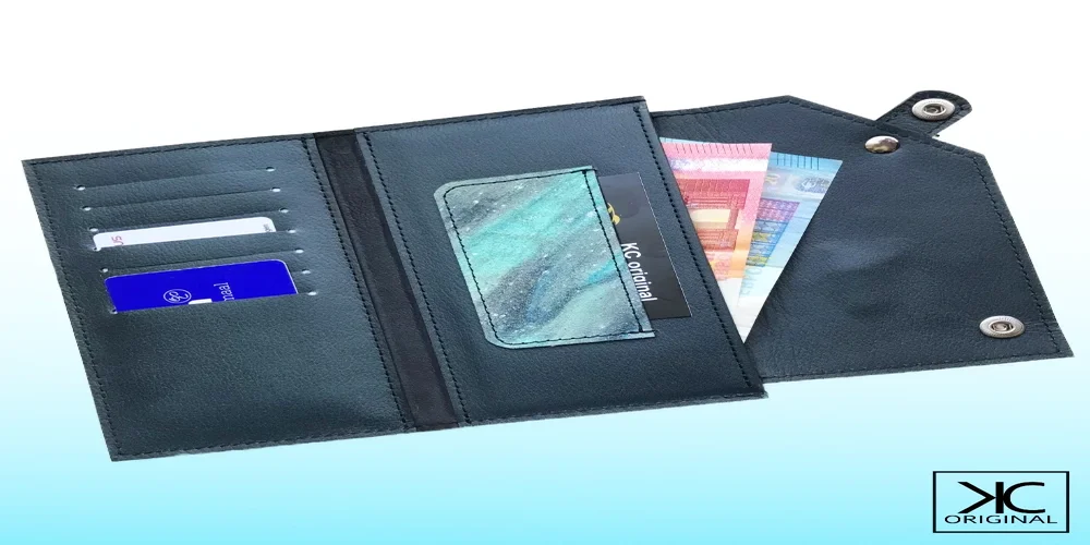 Binnenin is ruimte voor betaalkaarten en briefgeld. De indeling kan naar wens worden aangepast: maximaal 14 kaarten, of juist een eenvoudiger indeling als je niet zoveel bij je draagt. Het platte model neemt nauwelijks ruimte in en past perfect bij je Jeronimo of JeroniMore tas.