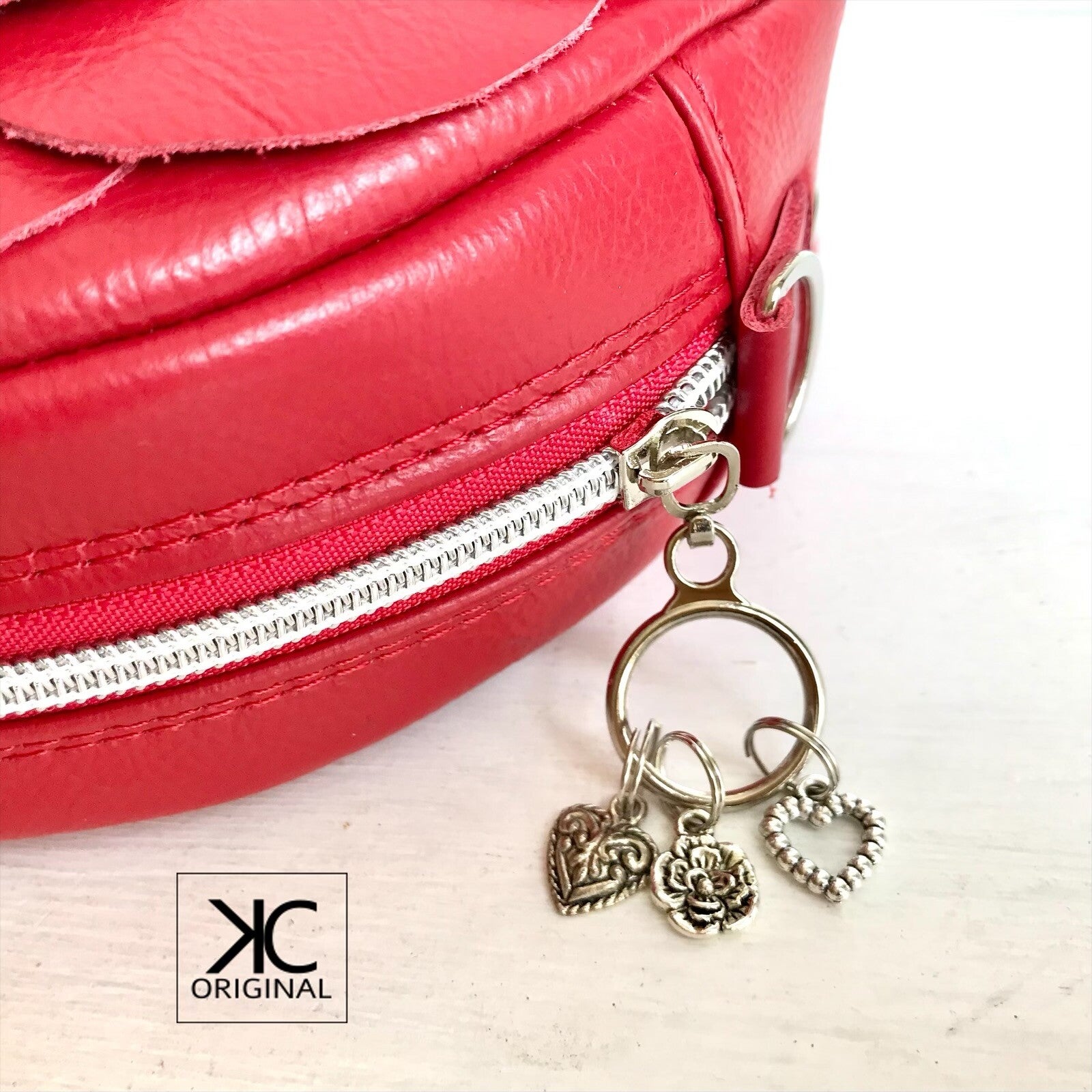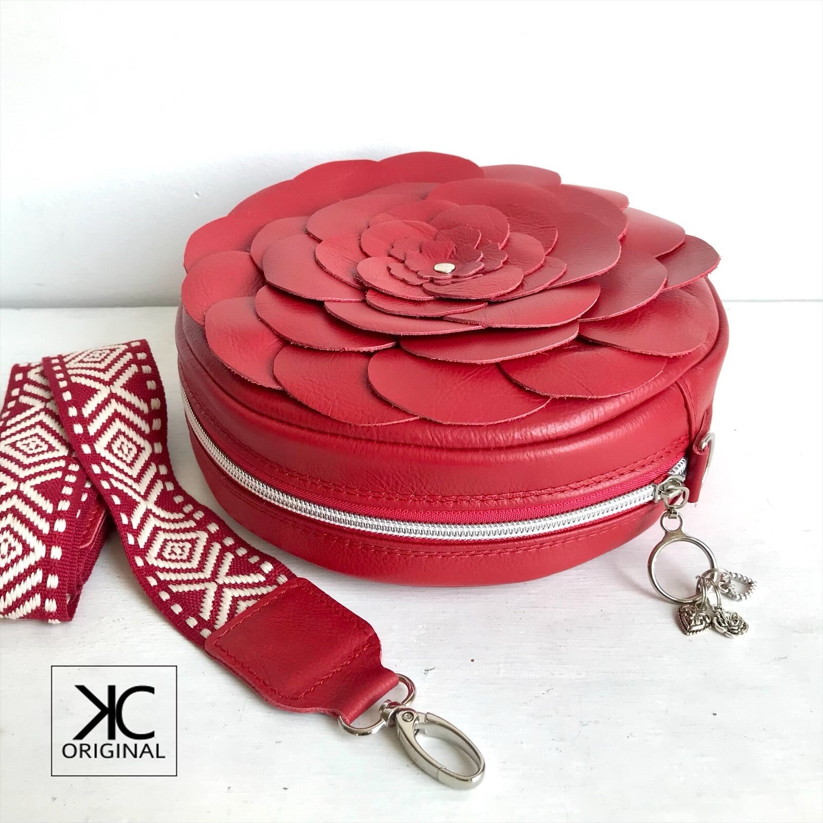 Crossbody De Roos in rood leer met opgelegde Roos op de voorkant.