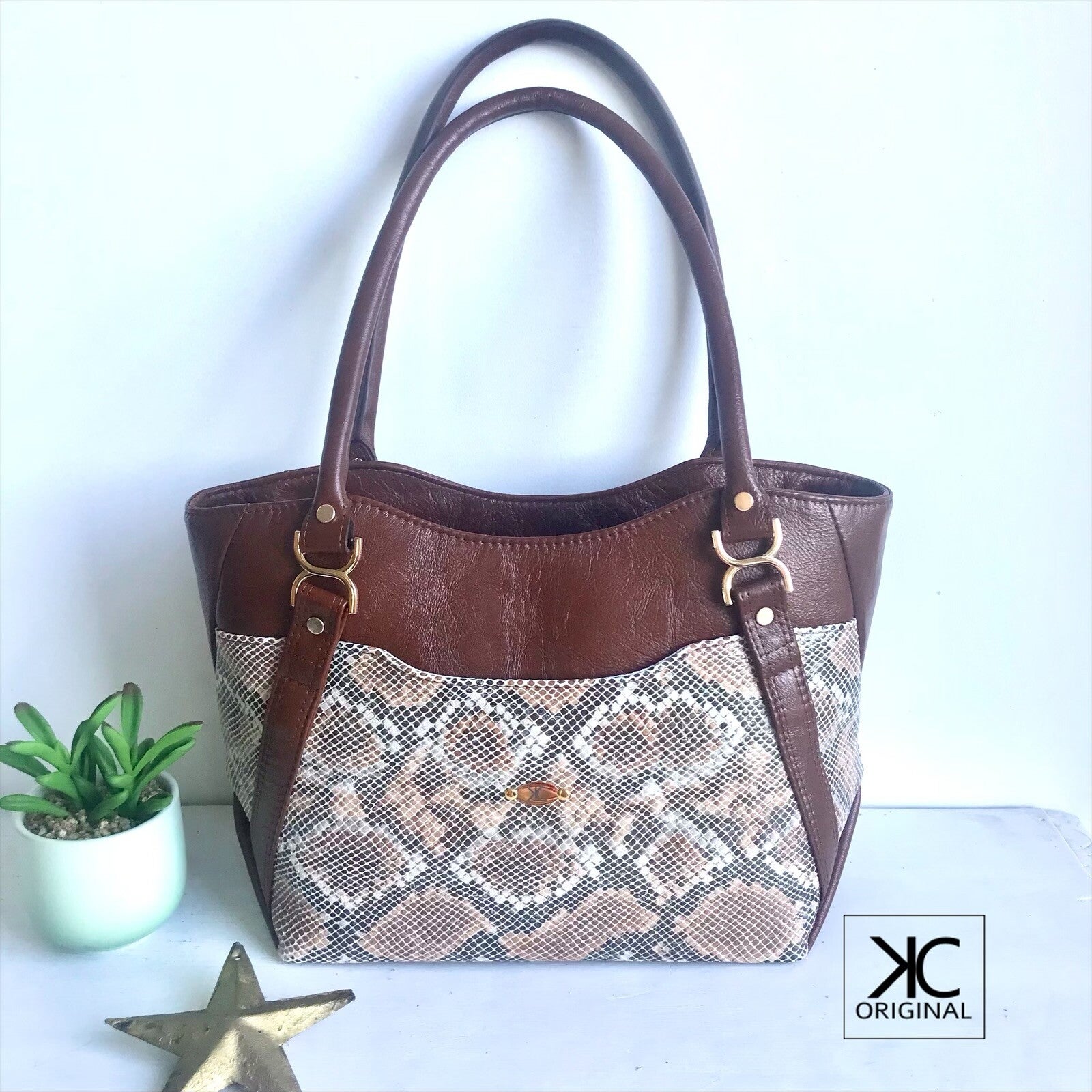 De Hiraeth is gemaakt van luxe leer met een prachtige slangenprint in warme bruintinten. Achter de voor- en achterpanelen vind je handige vakken, perfect voor spullen die je snel wilt pakken.