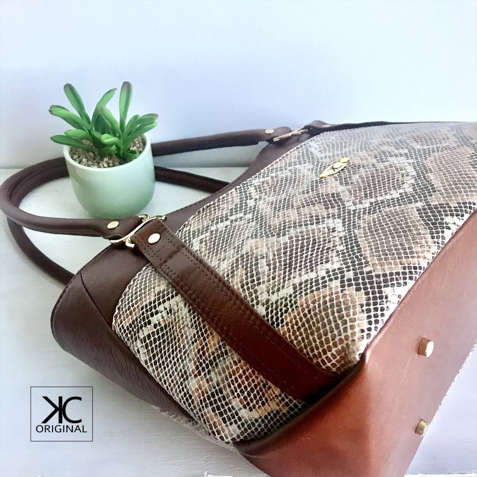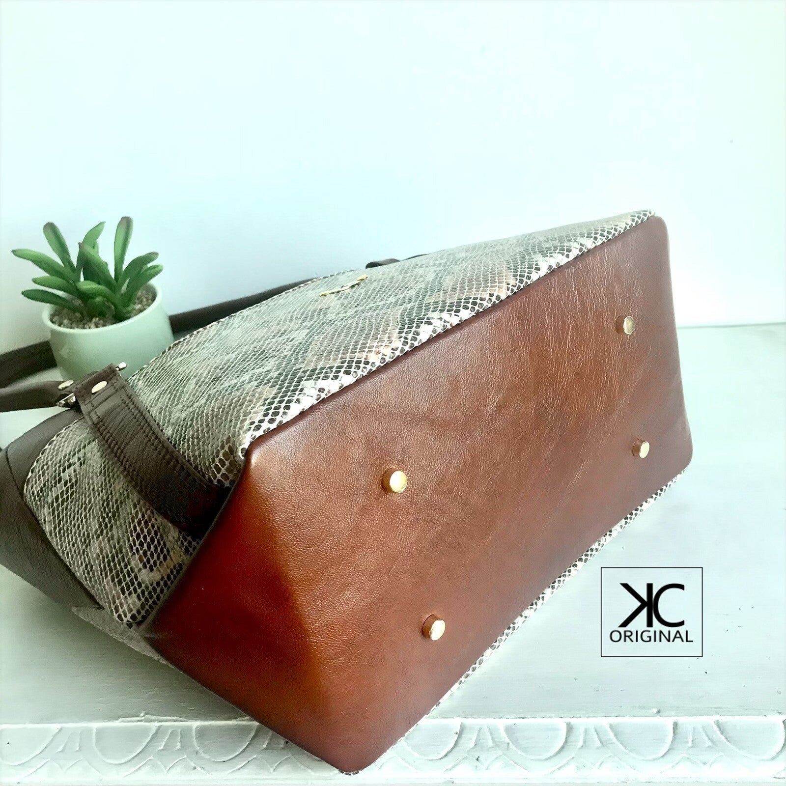 Het slangenleer is gecombineerd met doorleefd bruin leer met een zachte glans – een prachtige match. Ook de zijkanten trekken de aandacht: die zijn gemaakt met een speciale origami vouwtechniek.