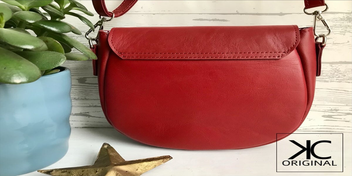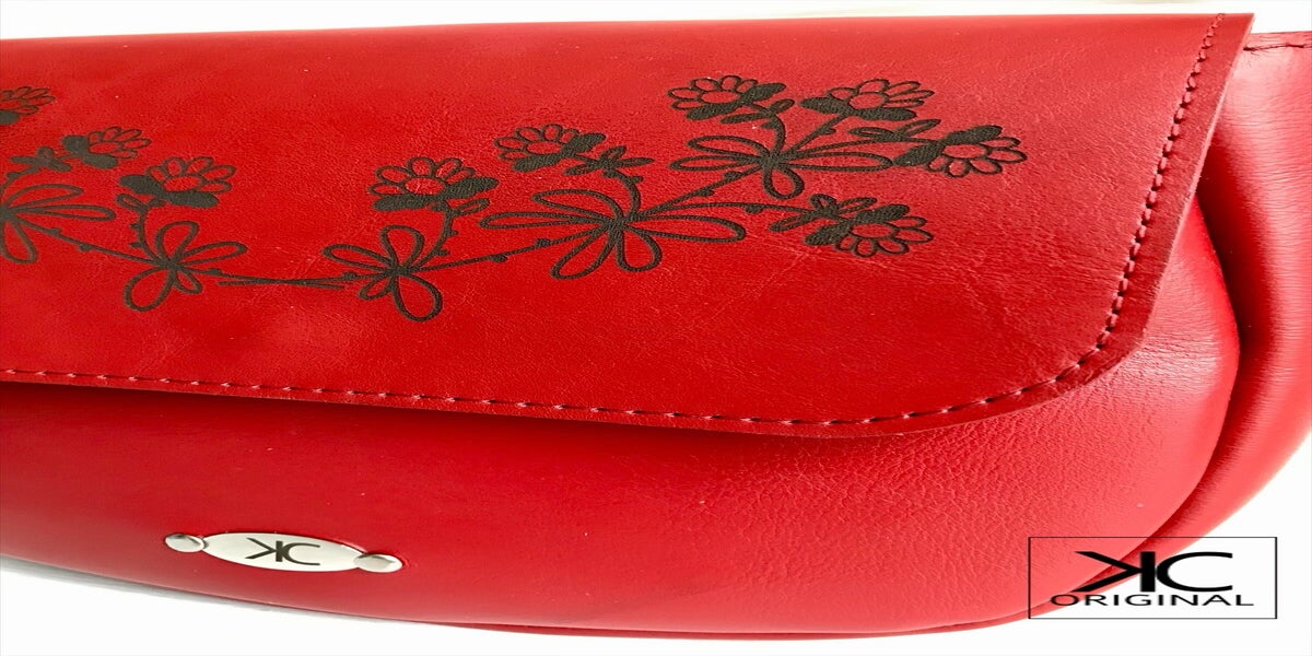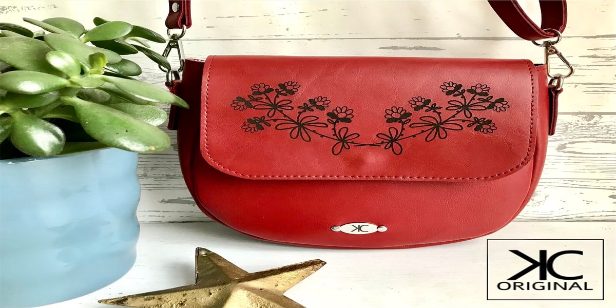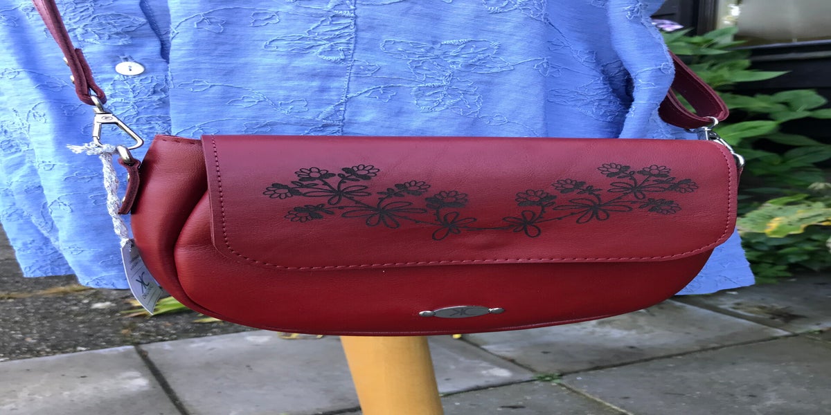 Hiernaast zie je twee leren uitvoeringen van het Jill tasje: een mooie donkerrode met sierlijke laser gravering op de flap en eentje in een makkelijk te combineren warme cognac kleur. Deze heeft ook nog een extra detail op de flap.