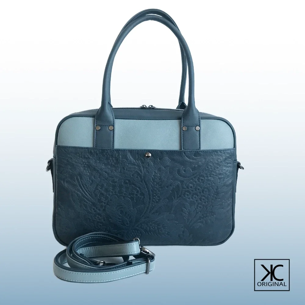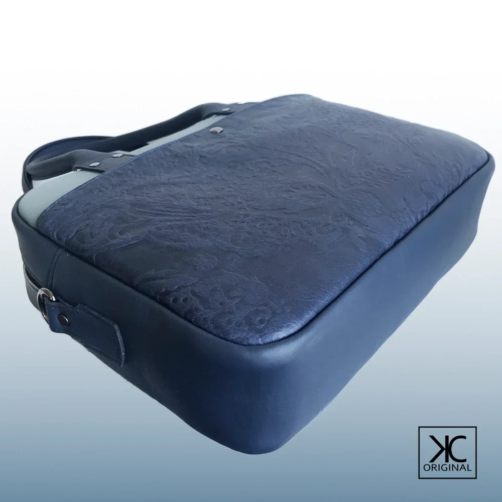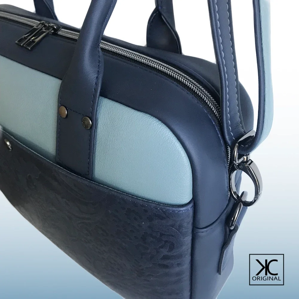 De buitenkant van de tas is gemaakt van blauw rundleer in verschillende tinten. Echt een chique combinatie. Op de voorkant zit een ritsvak. Op de achterkant bevind zich een groot insteekvak van prachtig donkerblauw embossed leer.