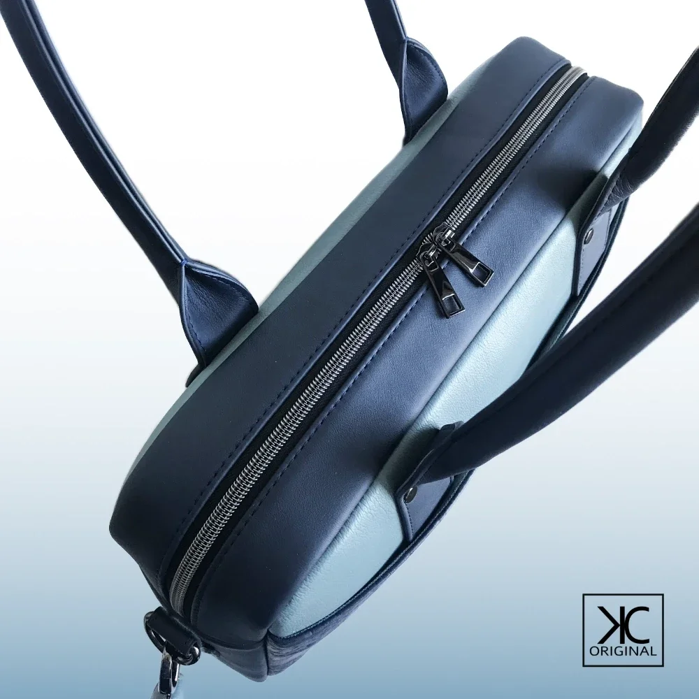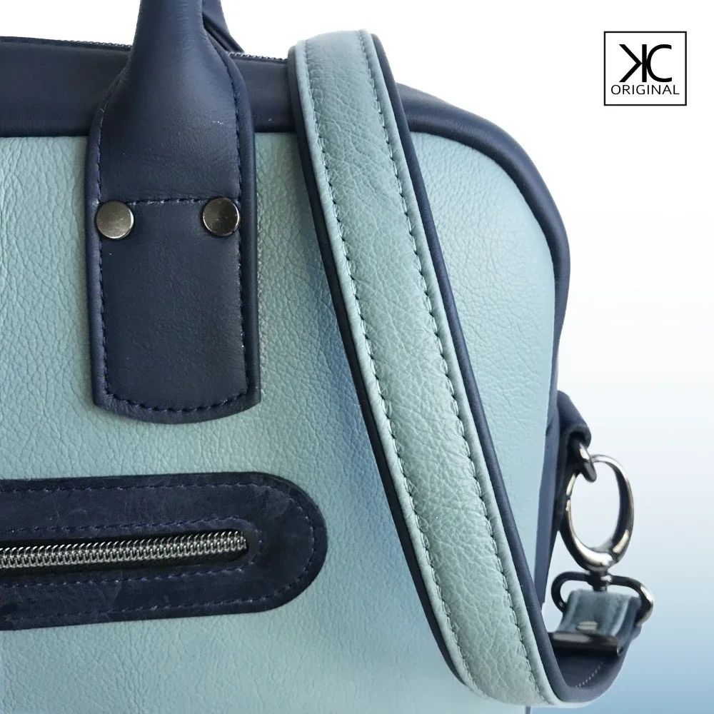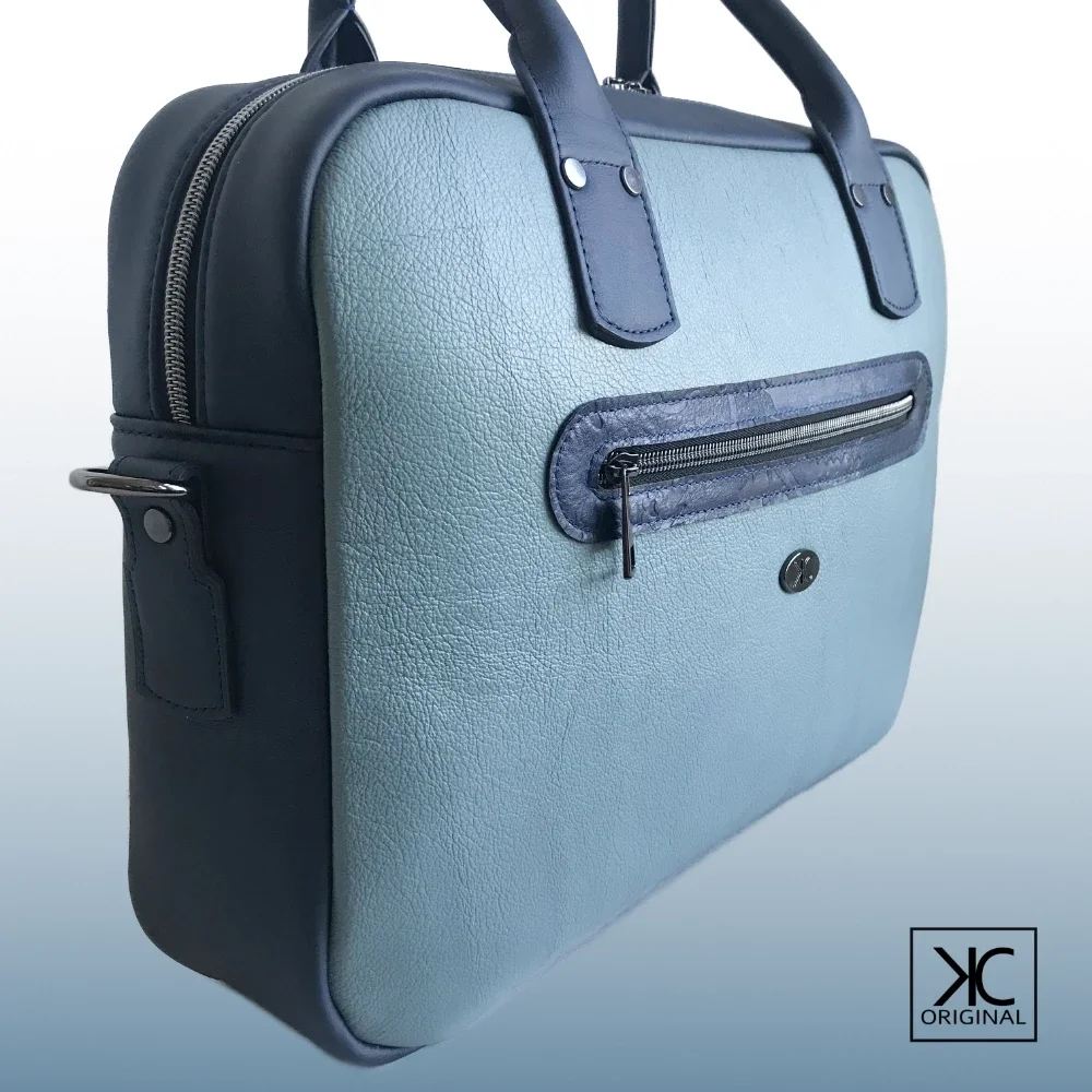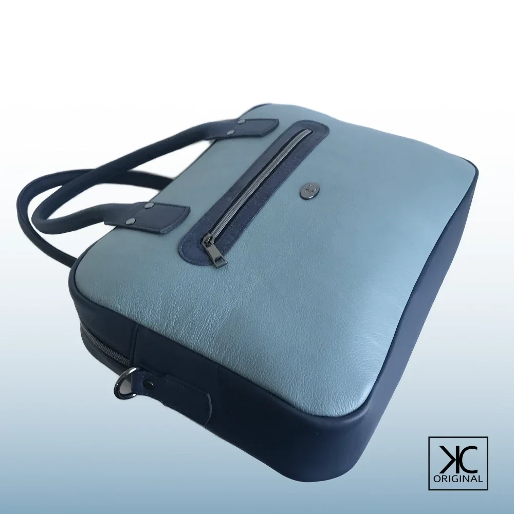 De buitenkant van de tas is gemaakt van blauw rundleer in verschillende tinten. Echt een chique combinatie. Op de voorkant zit een ritsvak. Op de achterkant bevind zich een groot insteekvak van prachtig donkerblauw embossed leer.