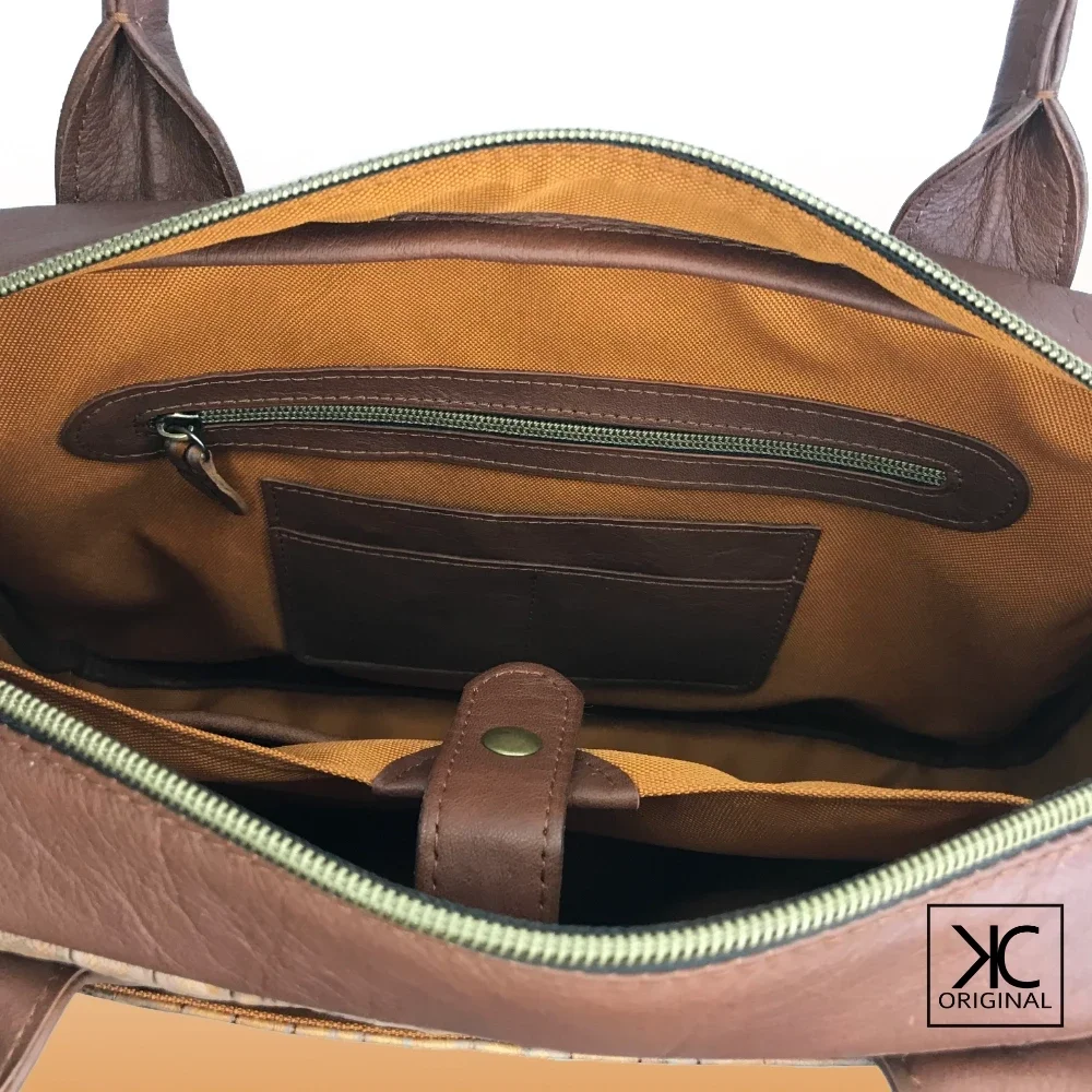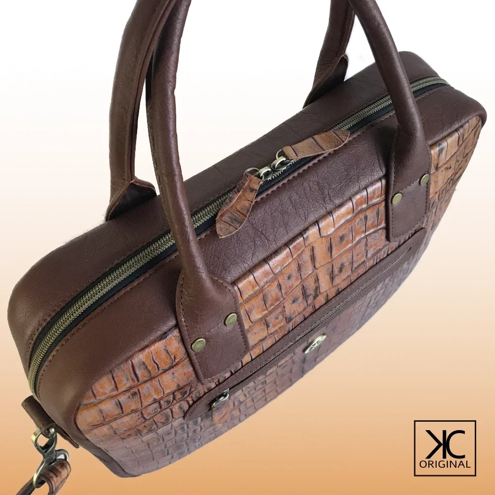 De buitenkant van de tas is gemaakt van twee soorten bruin rundleer: de voor- en achterkant zijn gemaakt van een prachtig stuk krokodil embossed rundleer. De zijkanten en handles zijn gemaakt van kastanjebruin rundleer. Beide leersoorten zijn gebruikt in de chique schouderband.