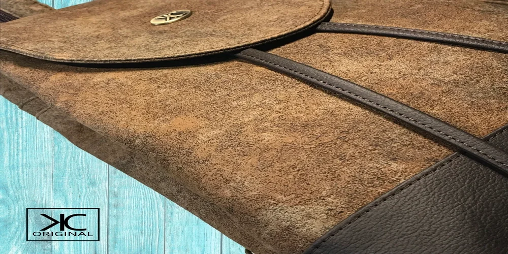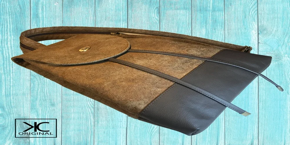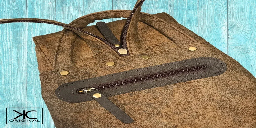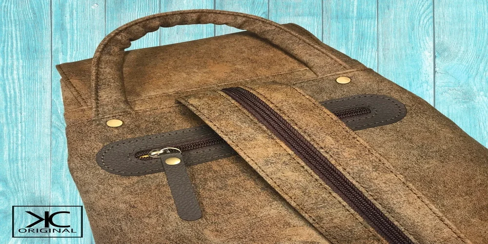 Deze Daytripster heeft een body van kunstleer. Het kunstleer is van hoogwaardige kwaliteit en heeft het uiterlijk van kurk. Erg mooi. De donkerbruine accenten zijn allemaal van echt leer gemaakt. Voor de voering is gekozen voor een palmbladeren print in zonnig okergeel.