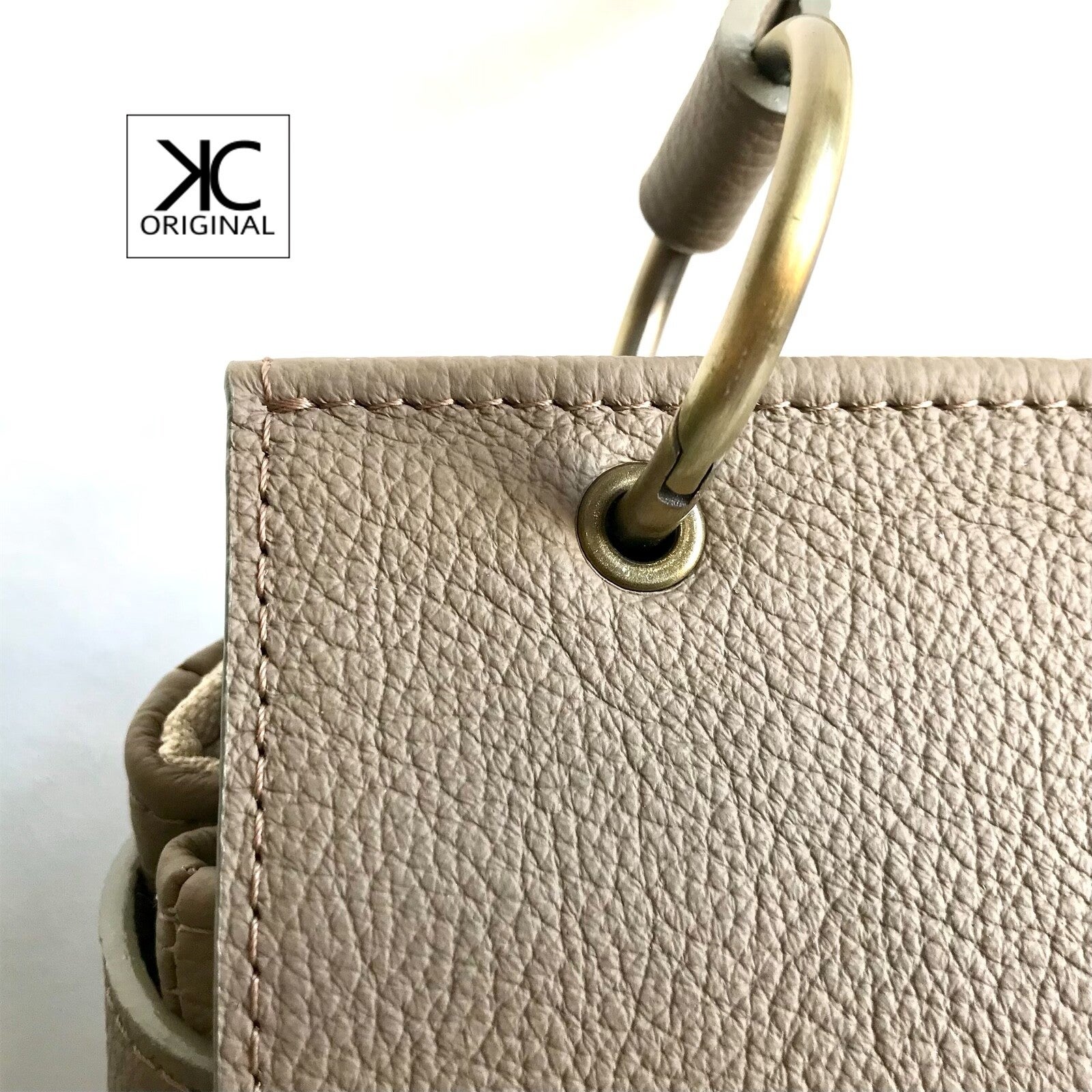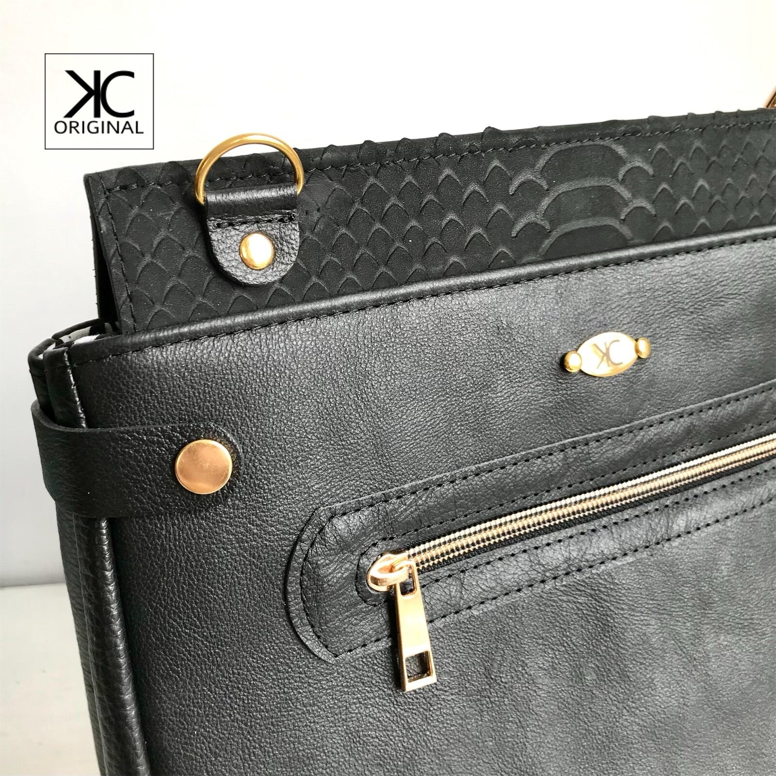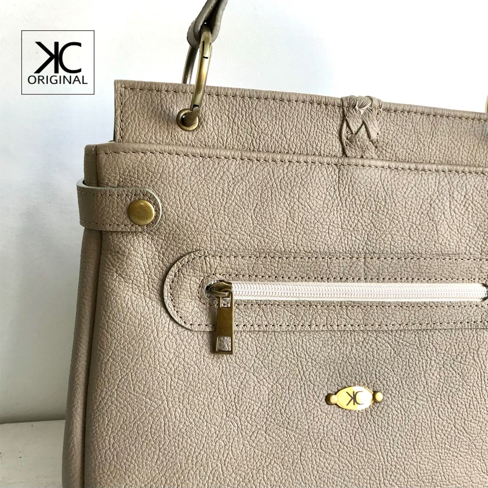 Op de achterkant van de tas bevindt zich een ritsvak. De zijkanten worden elegant samengevouwen met een bandje met drukkers. Hierdoor kan je de opening aanpassen naar gelang je behoefte.