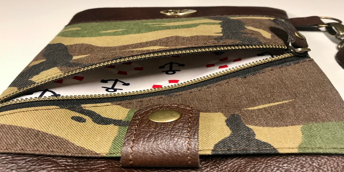 Echt een stoer exemplaar van de Mini Traveler Sling. Gemaakt van dikke legerstof met accenten in donkerbruin echt leer. Voor de voeringstof is gekozen voor een stofje met maritiem thema.
