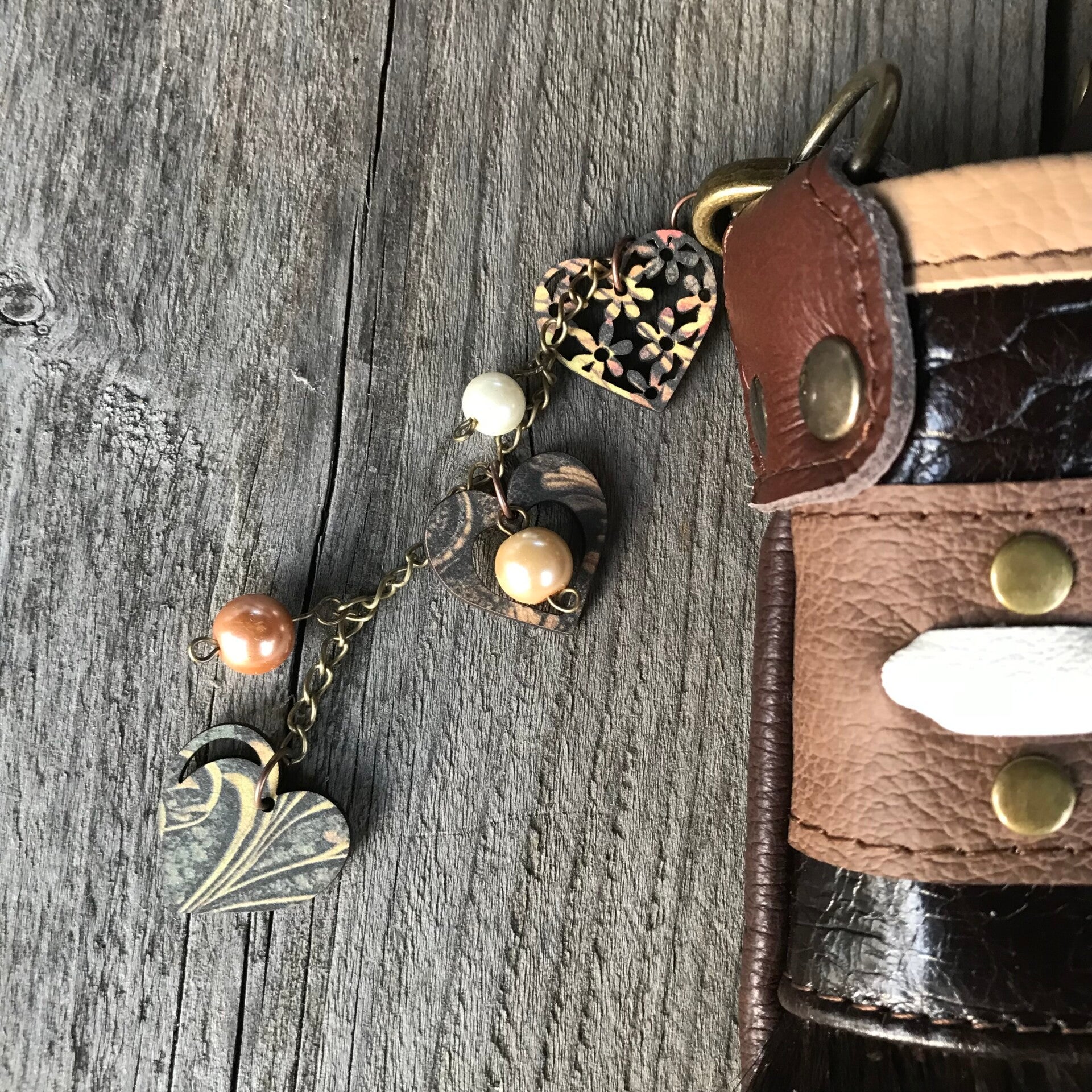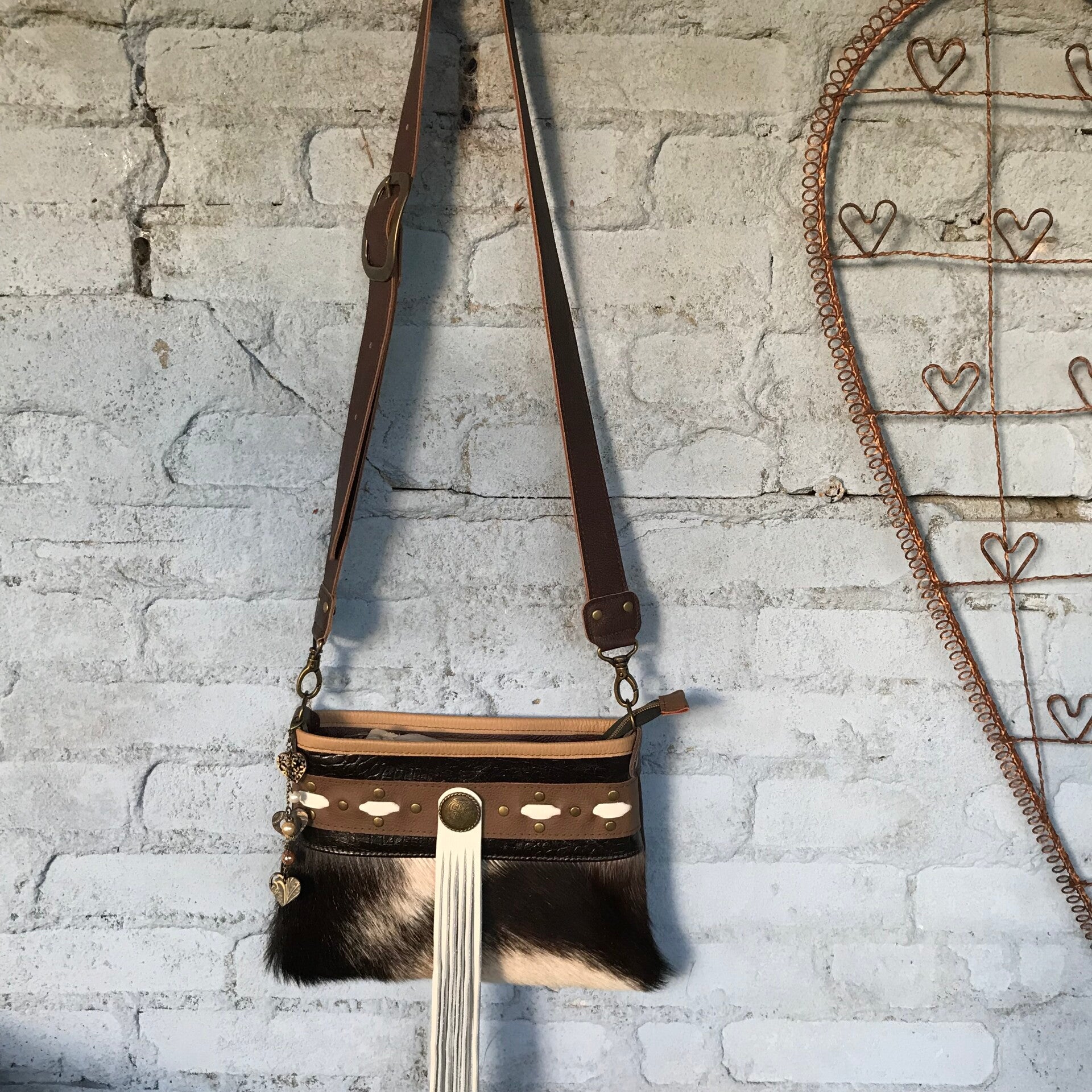 De voorkant springt direct in het oog dankzij de langharige bruin/beige gevlekte geitenvacht, rijk afgewerkt met rivetten en een concho met speelse fringe. Als finishing touch hangt er een tashanger met lasergesneden hartjes en kralen aan de tas voor een vleugje romantiek.