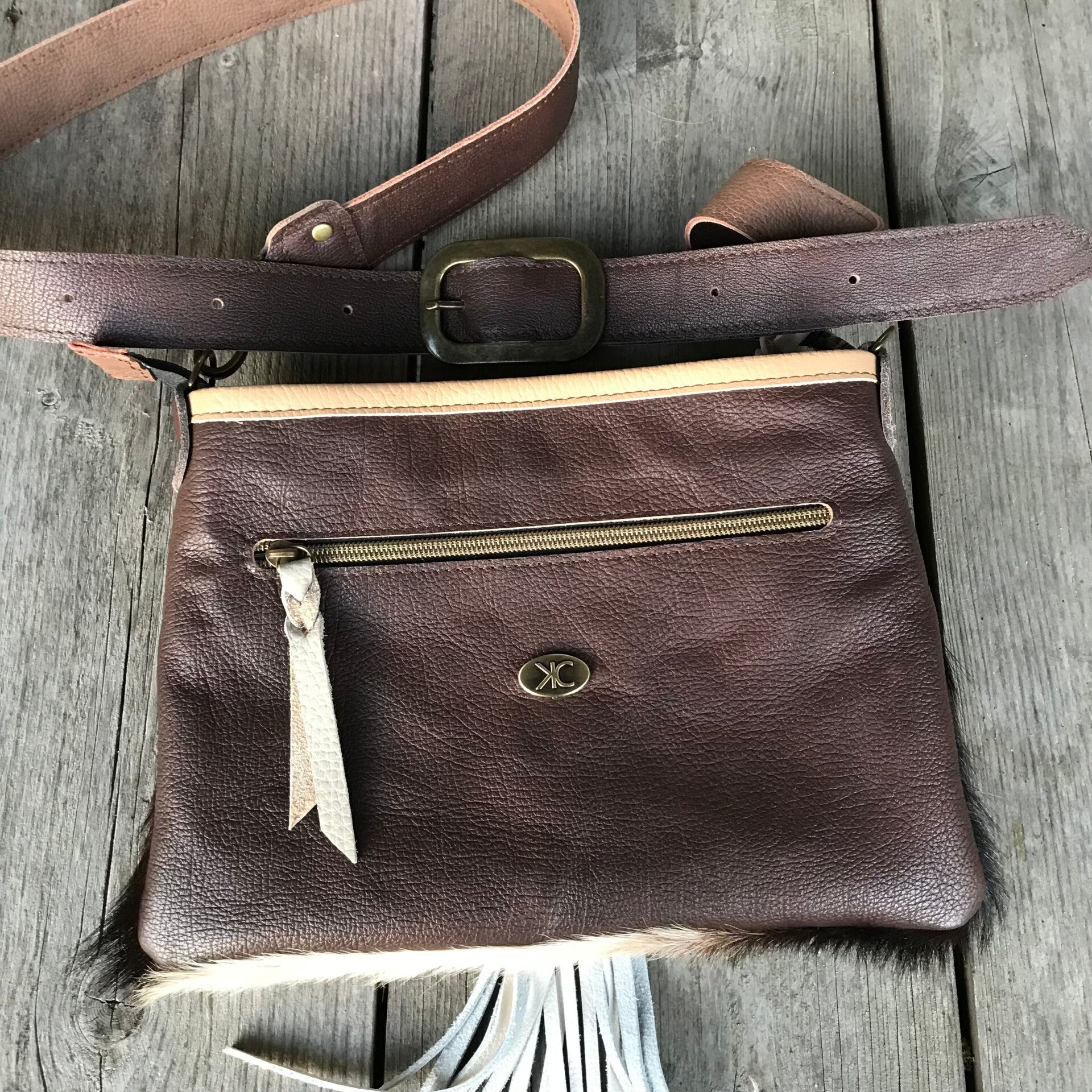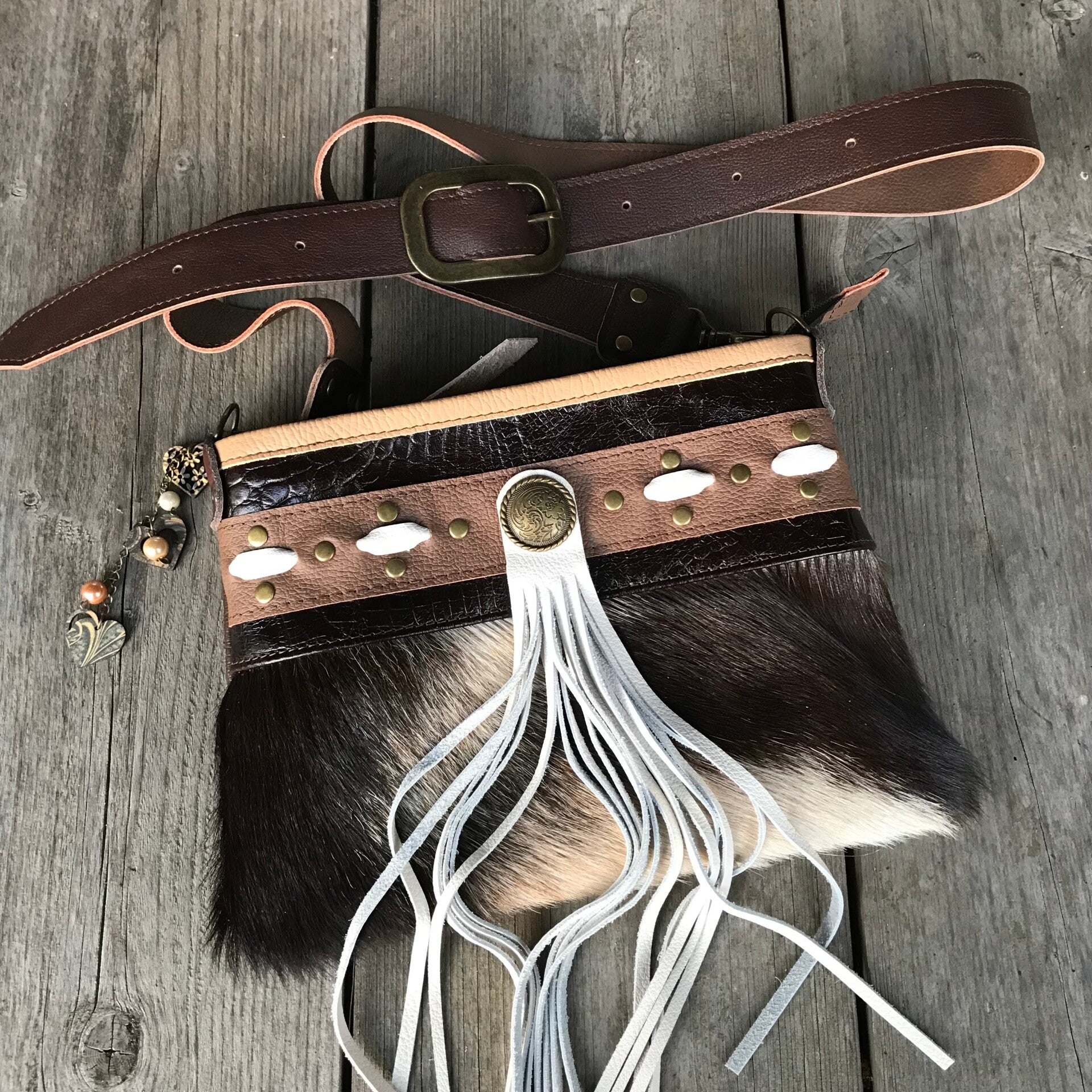 Een tas die de ziel van het Wilde Westen ademt – dat is de Western Belle. Stoer en stijlvol tegelijk, gemaakt van een bijzondere mix van materialen: een bruin/crème geitenvacht met rundleer in diverse tinten bruin en ecru. De stoffen voering met ratelslang motief maakt het Western thema helemaal af!
