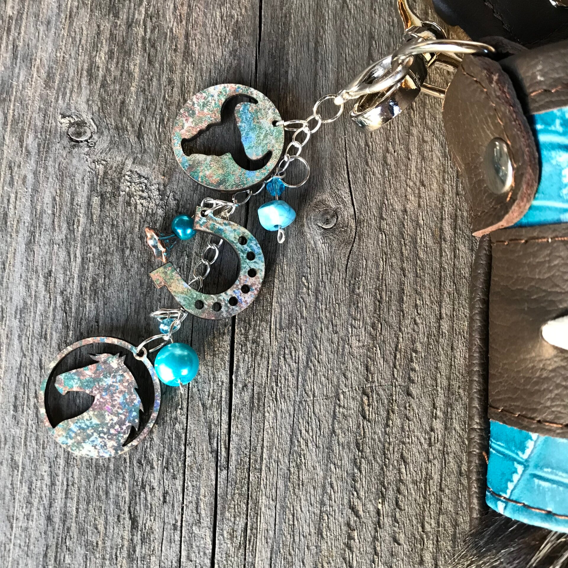 De voorkant springt direct in het oog dankzij de langharige geitenvacht, rijk afgewerkt met rivetten en een concho met speelse fringe. De geitenvacht heeft een paar speelse lichtere vlekjes. Als finishing touch hangt er een tashanger met lasergesneden Western designs en turquoise kralen – een detail dat de tas net een beetje extra western vibe geeft.