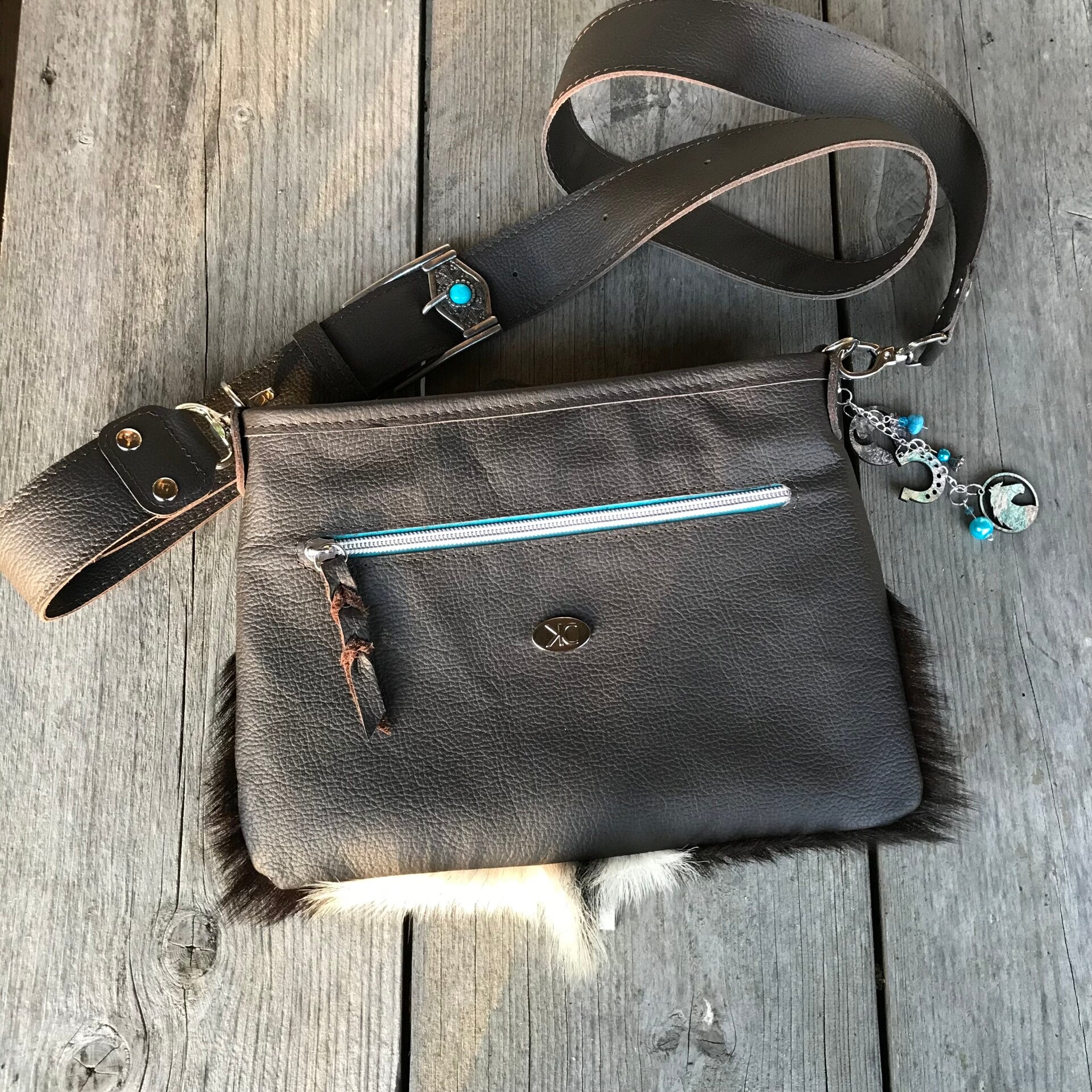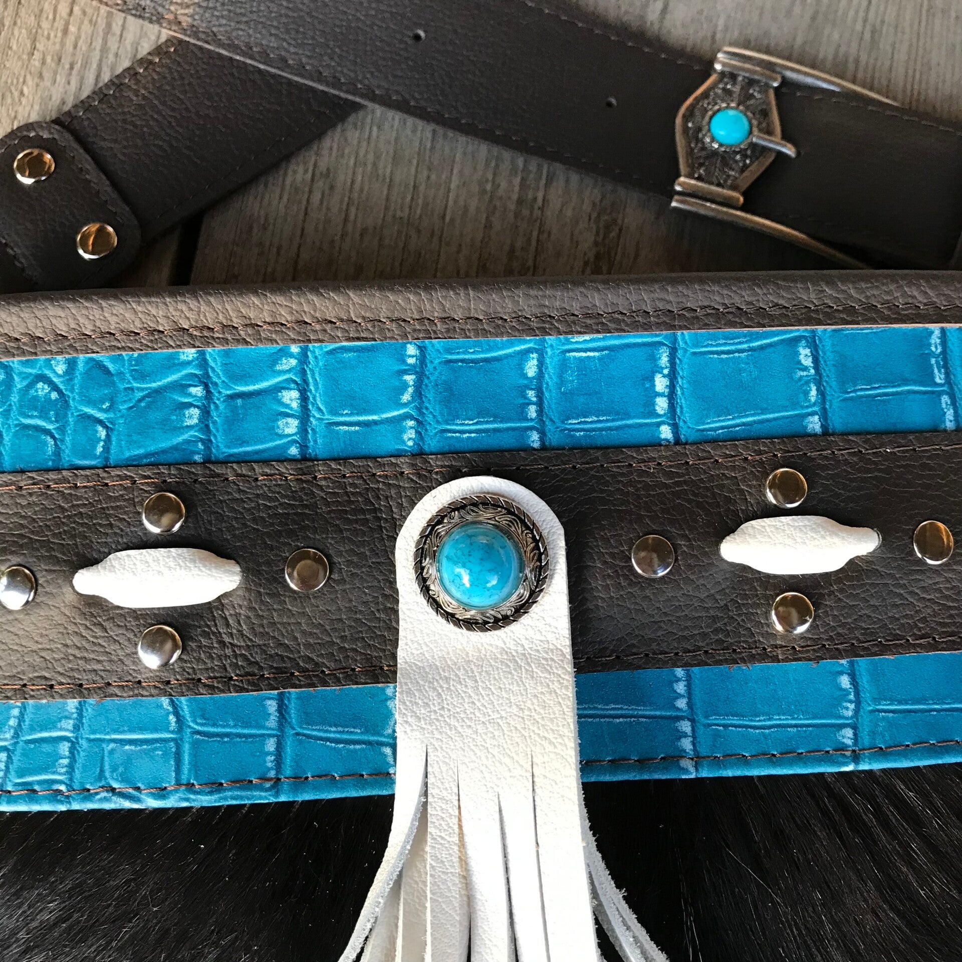 Een tas die de ziel van het Wilde Westen ademt – dat is de Western Belle. Stoer en stijlvol tegelijk, gemaakt van een bijzondere mix van materialen: geitenvacht in donkerbruin met lichte vlekje, turquoise leer met krokodil print en donkerbruin rundleer. Dit alles is gecombineerd met een katoenen voering met turquoise ovaaltjes.