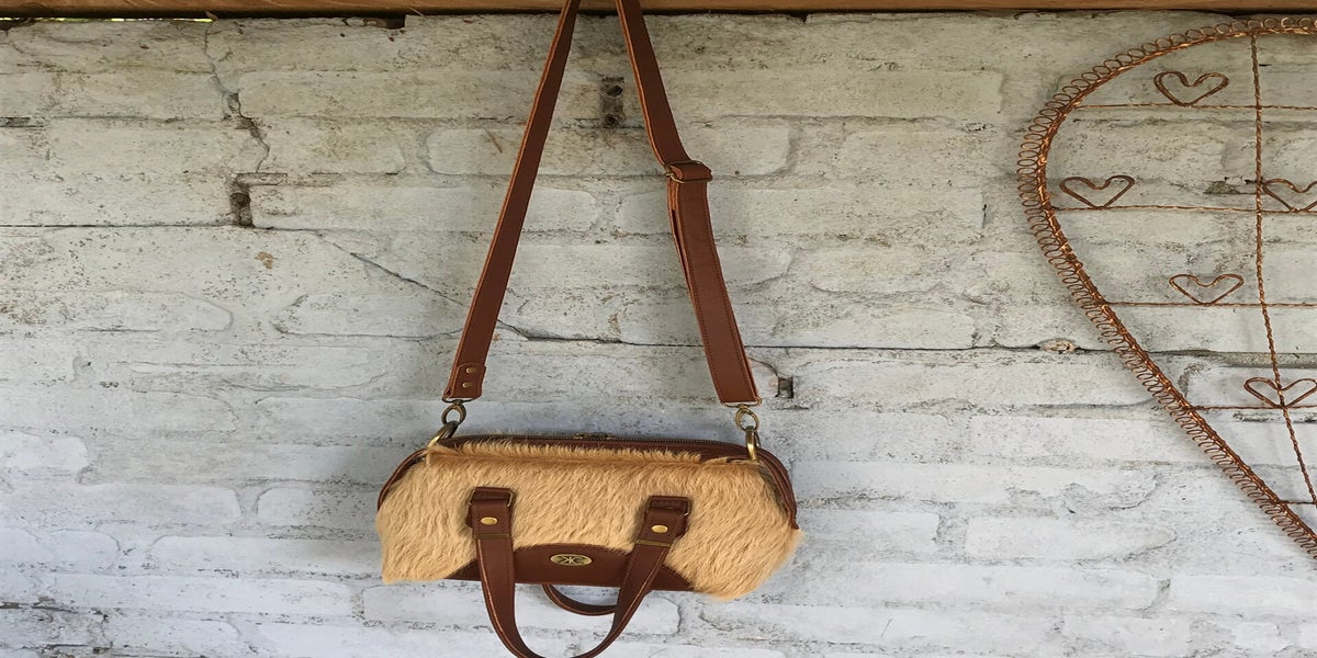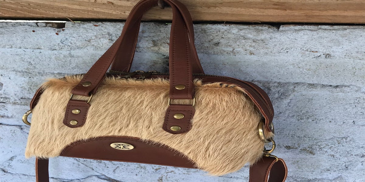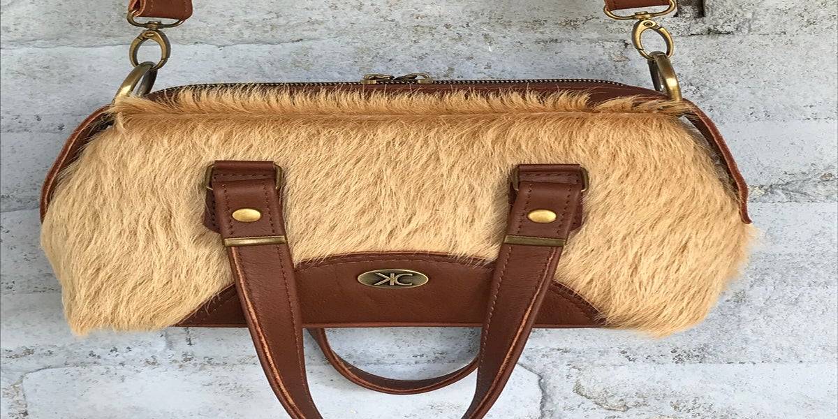 De tas is gemaakt van blonde koeienvacht en heeft accenten in kastanjebruin rundleer. Blikvanger is het ritspaneel aan de bovenkant dat doorloopt tot halverwege de zijkanten. Lekker stoer.